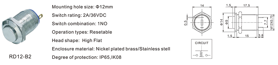 12MM金屬開關(guān)RD12-C2 金屬開關(guān) RD12-C2 36VDC 2A / / ≥100,000 CYCLES 立即申請(qǐng) 下載