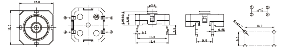 12.4X12.4mm輕觸開關(guān) | R2996 | 12VDC | 50mA | 4±1 N | 1.5±0.3mm | ≥100,000 CYCLES | 立即申請 | 下載 |
