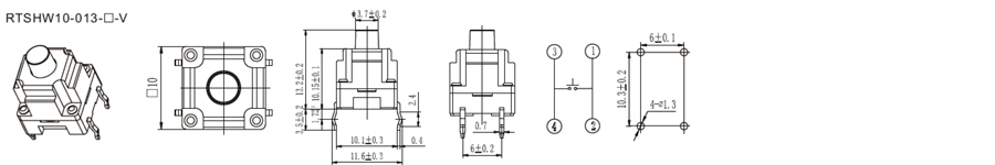 10x10mm輕觸開(kāi)關(guān) | RTSHW10 | 12VDC | 50mA | 2+1gf | 0.5±0.3mm | 1,000,000 cycles | 立即申請(qǐng) | 下載 |