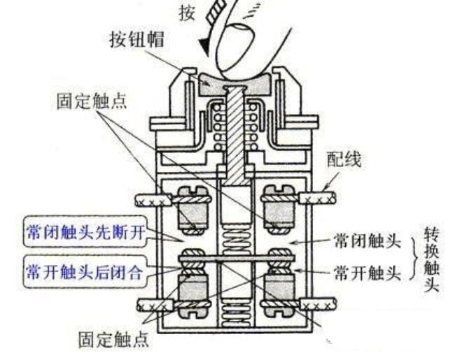 當(dāng)然這只是最普通的按鈕開關(guān)(也稱平鈕)的結(jié)構(gòu)示意圖,至于更復(fù)雜的帶燈按鈕,急停按鈕開關(guān)等,是在此基礎(chǔ)上進(jìn)行的改造與處理,當(dāng)然其本質(zhì)還是觸點(diǎn)的接通與閉合。