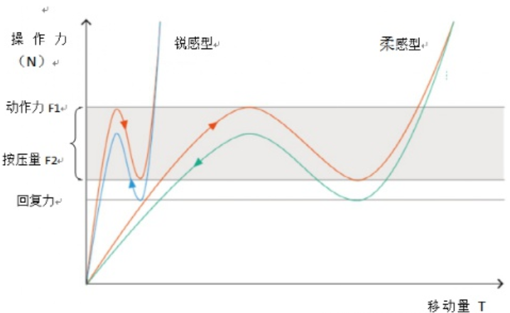 從以上曲線可以看出,影響輕觸開(kāi)關(guān)產(chǎn)品手感的因素有以下幾項(xiàng):