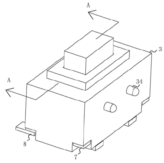 輕觸開關(guān)時(shí)先將簧片置于凹腔內(nèi),隨后將按鈕的一部分置于凹腔內(nèi),并與簧片相抵接,然后將蓋板罩設(shè)在凹腔之外,此時(shí)按鈕遠(yuǎn)離凹腔的一端穿過蓋板,隨后焊接端子,此時(shí)若助焊劑過多而在底座上流動(dòng),蓋板會(huì)將助焊劑阻擋在蓋板之外,使助焊劑不能從底座上部進(jìn)入輕觸開關(guān)的電路,而封閉件將蓋板的通孔封閉,使助焊劑不能從底座的下部進(jìn)入輕觸開關(guān)的電路,從而防止助焊劑進(jìn)入輕觸開關(guān)的電路。