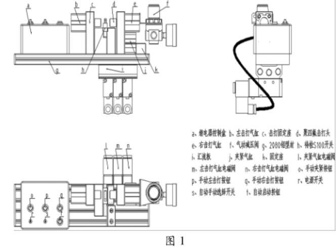 為實(shí)現(xiàn)簡(jiǎn)單高效的強(qiáng)度檢測(cè),該設(shè)備具體包括:(a)繼電器控制盒、(b)左擊打氣缸、(c)擊打固定座、(d)聚四氟擊打頭、(e)右擊打氣缸、(f) 氣動(dòng)減壓閥、(g)2080 鋁型材、(h) 待檢S100 開(kāi)關(guān)、(i)匯流板、(j)夾緊氣缸、(k)固定座、(l)夾緊氣缸電磁閥、(m)左擊打氣缸電磁閥、(n) 右擊打氣缸電磁閥、(o)手動(dòng)夾緊按鈕、(p)手動(dòng)左擊打按鈕、(q)手動(dòng)右擊打按鈕、(r)電源開(kāi)關(guān)、(s)自動(dòng)手動(dòng)選擇開(kāi)關(guān)、(t)自動(dòng)啟動(dòng)按鈕。