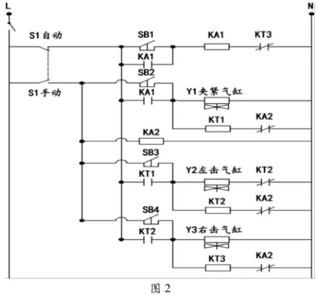 其動(dòng)作邏輯是這樣,當(dāng)電源開(kāi)關(guān)處于 on,手自動(dòng)選擇開(kāi)關(guān)S1 處于自動(dòng)狀態(tài)時(shí),按下 SB1 啟動(dòng)按鈕,設(shè)備會(huì)按照原理圖執(zhí)行一個(gè)動(dòng)作循環(huán),KA1 中間繼電器得電并進(jìn)行自鎖,電磁閥 Y1線圈得電吸合,夾緊氣缸動(dòng)作,與此同時(shí) KT1 時(shí)間繼電器開(kāi)始計(jì)時(shí),計(jì)時(shí)到達(dá)預(yù)設(shè)后,電磁閥 Y2 線圈得電吸合,左擊打氣缸動(dòng)作,同時(shí) KT2 時(shí)間繼電器開(kāi)始計(jì)時(shí),計(jì)時(shí)到達(dá)預(yù)設(shè)后,電磁閥Y2 線圈失電,左擊打氣缸復(fù)位,同時(shí)電磁閥 Y3 線圈得電吸合,KT3 時(shí)間繼電器開(kāi)始計(jì)時(shí),計(jì)時(shí)到達(dá)預(yù)設(shè)后,KT3 時(shí)間繼電器常閉觸點(diǎn)斷開(kāi)主回路,KA1 中間繼電器自鎖失效,氣缸全部復(fù)位,完成一個(gè)自動(dòng)工作循環(huán);手動(dòng)模式則可實(shí)現(xiàn)對(duì)每個(gè)氣缸實(shí)現(xiàn)單電動(dòng)作的要求,使工作簡(jiǎn)單方便。