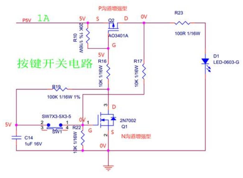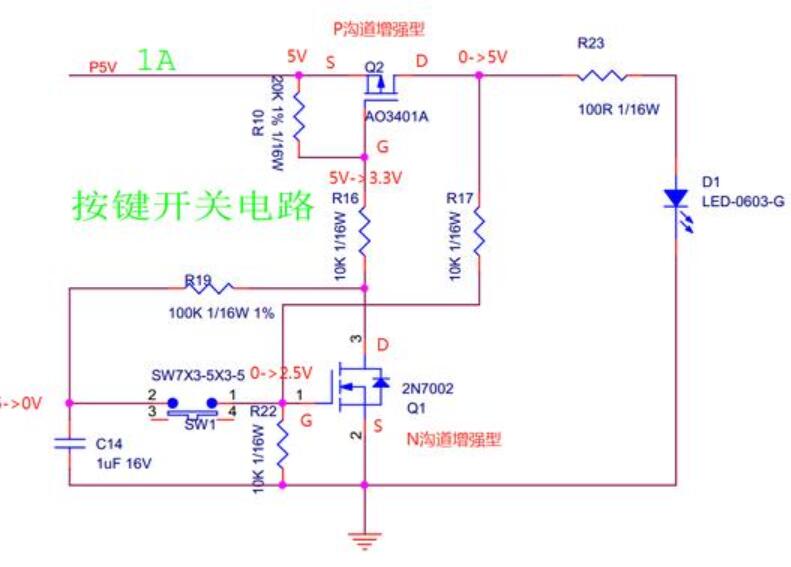 開關(guān)按鍵按下時(shí),Q1的G點(diǎn)電壓瞬間拉高到5V(C14通過SW放電),然后再被拉回2.5V(由于R17,R22分壓作用),GS電壓2.5V達(dá)到閾值電壓,DS導(dǎo)通。由于R10和R16的分壓作用,Q2的G點(diǎn)電壓為3.3V,GS電壓為-1.7V達(dá)到閾值電壓,DS導(dǎo)通,輸出5V,LED燈亮。C14通過R19->Q1->DS放電,電壓為0